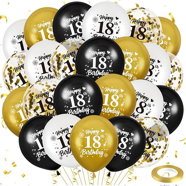 18. doğum günü balon seti:Fabrikamızın piyasaya sürdüğü 18. doğum günü balon seti, folyo balonlar, lateks balonlar, doğum günü bayrakları, doğum günü kartları, kurdeleler ve diğer aksesuarları içermektedir. Siyah altın, yeşil altın, gül altın, mavi altın vb. gibi seçim yapabileceğiniz birçok renk vardır. Bu renkler üst düzey ve zariftir, tüm partiyi daha zarif hale getirir ve doğum günü töreni duygusu katar. Üstelik son derece uygun maliyetli olan bu paket, uygun fiyata unutulmaz bir 18. yaş günü partisi düzenlemenize olanak tanıyor.