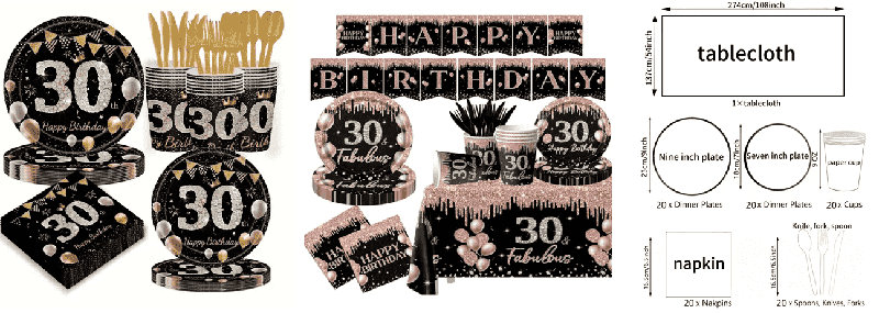 Kağıt doğum günü kartı, pasta dekorasyonunun özüdür: ana kart, "30. Doğum Günün Kutlu Olsun" gibi kelimelere dayanmaktadır ve şampanya bardağı şekliyle eşleştirilmiştir. Boyutu büyüktür ve ana pastayı süslemek için uygundur. Ayrıca kalınlaştırılmış sert kartondan yapılmış, alt kısmında bambu çubuklar bulunan, kullanım için takılabilen, keklere uygun dairesel "30" logosu, yıldızlar, taçlar ve diğer küçük kartlar da bulunmaktadır.