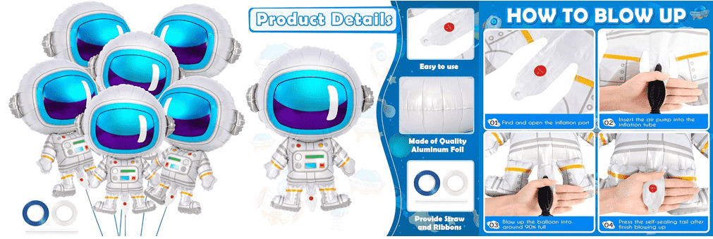 Astronot folyo balonGenellikle parti dekorasyonu, festival düzeni ve diğer etkinlikler için kullanılan, teması astronotların resmi olan bir tür balondur. Alüminyum folyo malzemeden yapılmış olan bu malzeme iyi bir hava sızdırmazlığına sahiptir, uzun süre şişirilmiş bir durumu koruyabilir, renklidir ve solması kolay değildir, güvenli ve toksik değildir ve tekrar kullanılabilir.