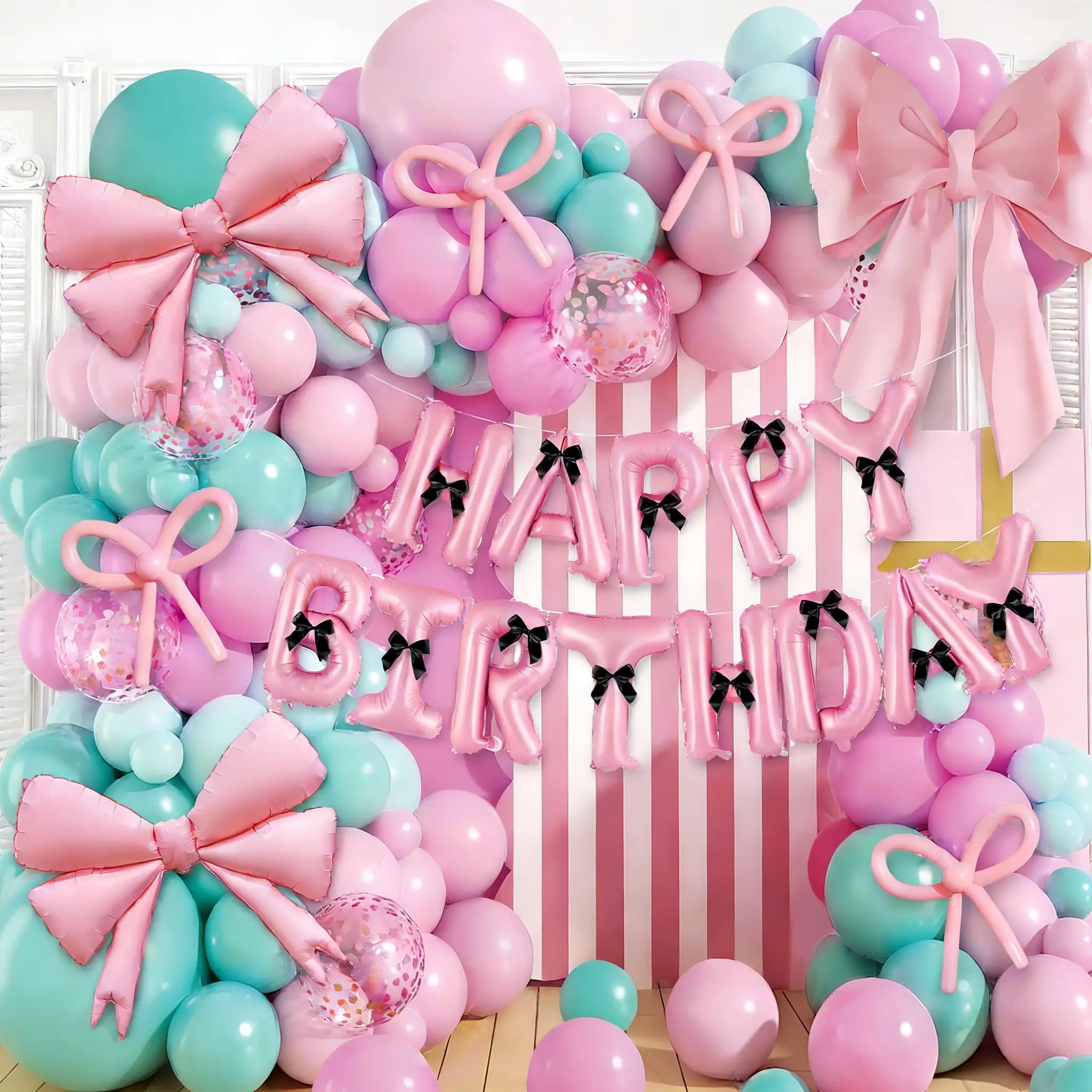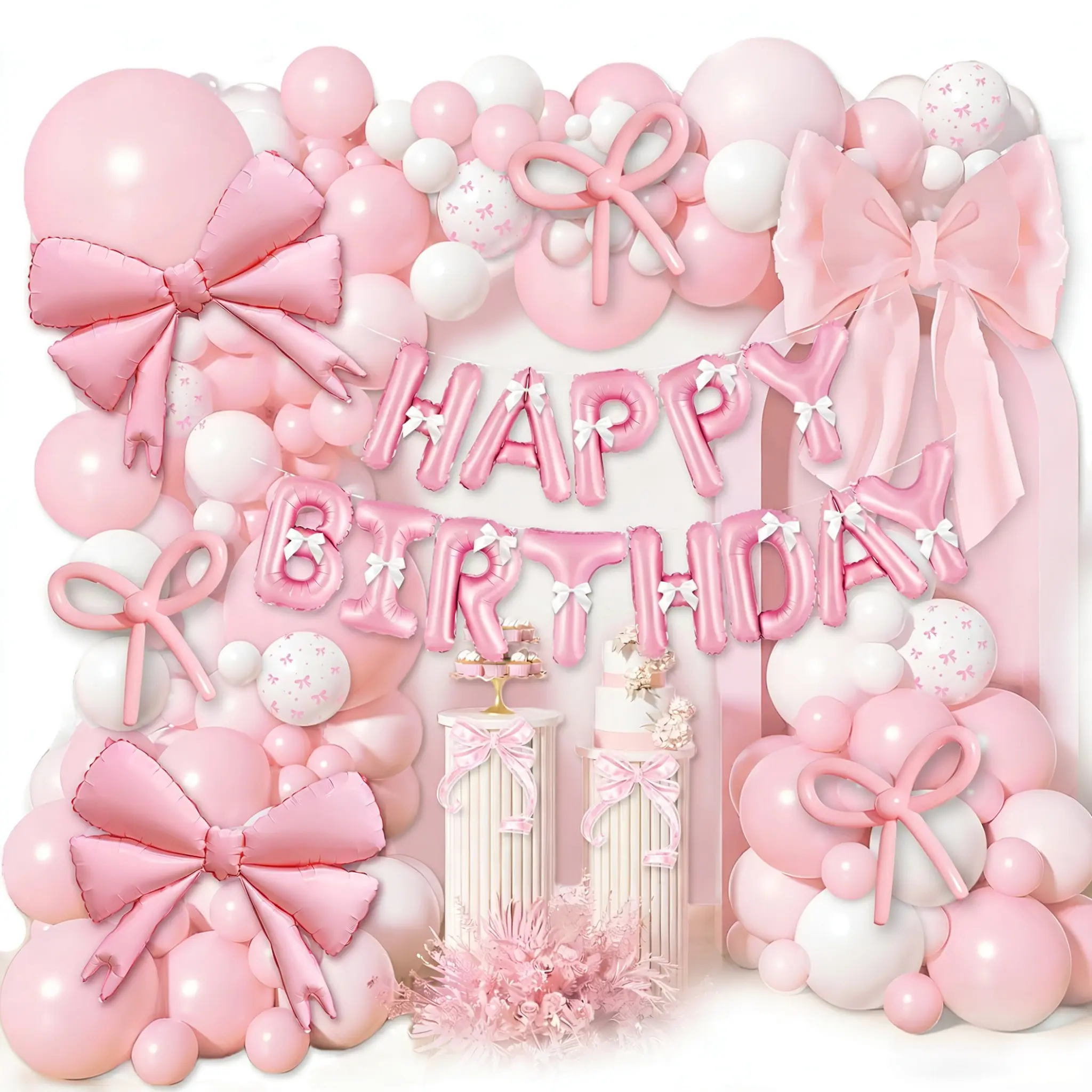 Bu set, 5 inç, 10 inç, 12 inç ve 18 inçlik mat bebek pembe balonu, 5 inç, 10 inçlik mat beyaz renk, folyo pembe fiyonklu balon, mat bebek pembesi 260 uzun balon, şerit fiyonk, tutkal noktası ve balon dekorasyon şeridini içerir.