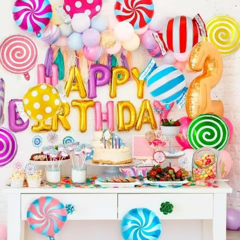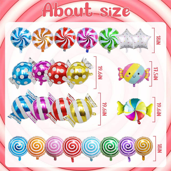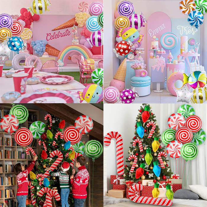 Candy serisi folyo balonlar şu anda çeşitli renk ve stillerde mevcut olup yetişkinler, çocuklar, erkek çocuklar, kızlar ve her yaştan insan için yeni bir şeker temalı parti dekorasyonu yaratmaktadır. Parlak ve renkli Noel şekeri temalı balonlar, sevimli lolipop temalı parti folyo balon takımı, doğum günü temalı parti dekorasyonunuza sevimli bir ektir. Folyo şeker balonu, diğer şeker partisi dekorasyonlarıyla mükemmel uyum sağlayarak lolipop seven arkadaşlar için güzel bir hediye, arka plan ve fotoğraf dekoru oluşturur.