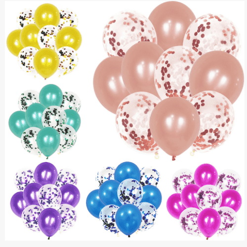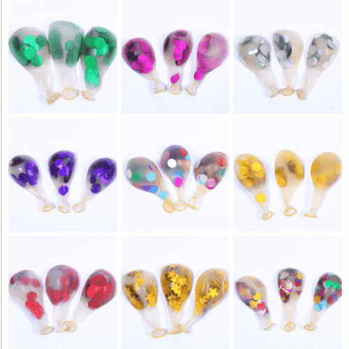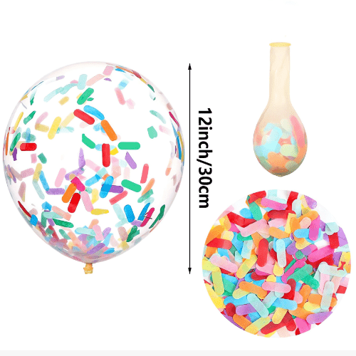 Konfeti balonları genellikle 12 inç şeffaf lateks balonlar kullanır. Her balon 1g konfeti içerir ve her paket 100 adet tutabilir. Bu boyuttaki konfeti balonları sıklıkla kullanılır ve ister küçük balon elbiselerinde ister balon çelenk kitlerinde daha iyi sonuçlara sahiptir.