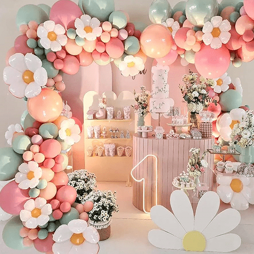 Doğum günü partisi: Papatya balon çelengi, doğum günü partileri için arka plan dekorasyonu olarak kullanılabilir, çocuk veya kadın doğum günü partilerinde düzenlemeye uygun, neşeli bir atmosfer yaratır.