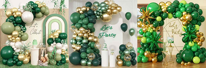 Mat yeşil, koyu yeşil ve diğer yeşil balonlar altınla karıştığında yeşilin farklı tonları, kemerde yakalanmış bir orman yaşamı ve eski moda zarafet hissi veriyor. Altın güneş ışığı gibi parlayarak tüm rengi daha parlak hale getirir. Değişen yeşil, kemeri canlı tutar ve metalik altın, yeşilin ağırlığını yumuşatır. Sonuç, birçok retro parti sahnesine uyum sağlayacak şekilde doğal, zengin ve gösterişli bir his veriyor.