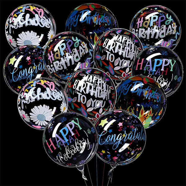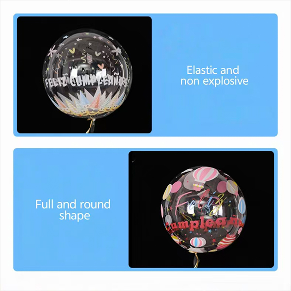 Basılı mutlu yıllar bobo balonunda “mutlu yıllar” kelimeleri ve balonun yüzeyinde basılmış bazı tasarımlar var. Baskı açık ve parlak. Renk solmaz. Tasarımın ana özelliği tek parça formdur. Kelimeler ve tasarımlar balonun bir parçasıdır. Görünüm daha iyi ve daha profesyonel. Basılı tip birçok renk ve birçok desenle birlikte gelir. Bunlar yıldızlar, kronlar, notlar ve diğer şekillerdir. Açık balon yüzeyinde derinlik ve katmanlar gösterirler. Balon daha yüksek ve daha zarif görünüyor. Güzel bir parti dekorasyonu için iyidir.