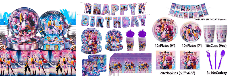 Temalı parti sofra takımları arasında kağıt tabaklar, kağıt bardaklar, peçeteler, bıçaklar, çatallar ve pasta süsleme kartları bulunur. Her sofra takımı Demon Hunters öğeleriyle basılıyor ve Mutlu Yıllar ve Parti Zamanı sözcükleri yazılarak mutlu bir parti atmosferi yaratılıyor. Parti sofra takımları kalitelidir ve gıda güvenliği standartlarını karşılar. Kağıt tepsiler ve bardaklar, kokusuz ve zararlı katkı maddeleri içermeyen, gıdaya uygun kalın kağıttan yapılmıştır. Baskı mürekkebi çevre dostu ve güvenlidir, toksik değildir ve zararsızdır ve gıdayla doğrudan temas edebilir.