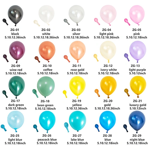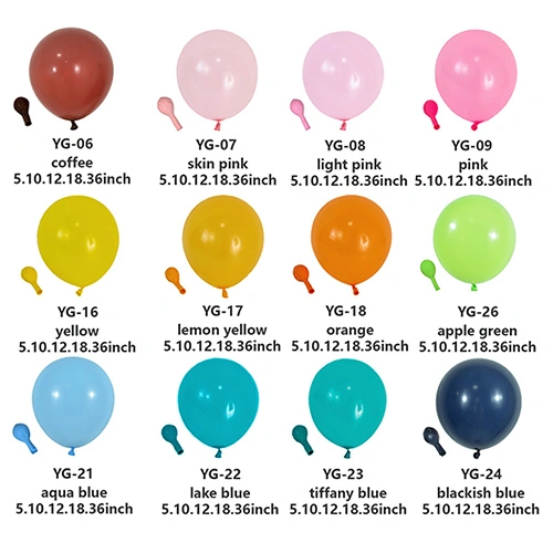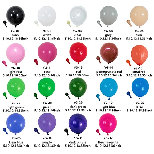 Lateks balonlarımız genellikle 5 inç, 10 inç, 12 inç, 18 inç ve 36 inç olarak üretilmektedir. Özel gereksinimleriniz varsa ve balonları özelleştirmeniz gerekiyorsa, diğer boyutlarda da üretim yapabiliriz.