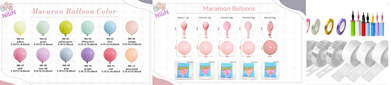 Macaroon renkli balonlar çelenk kemeri yumuşak ve rüya gibi renkleriyle popülerdir. Tüm set 12 nazik Macaroon rengine odaklanıyor. Macaroon Red, Macaroon Blue, Macaroon Mor ve diğer renklere sahiptir. Her renk taze ve romantik bir görünüm getirir.