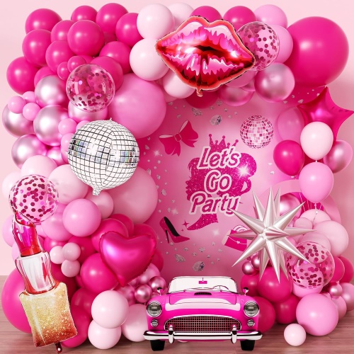 Setler arasında 5 inç ve 12 inç mat pembe lateks balonlar, 5 inç ve 12 inç inci pembe lateks balonlar, 5 inç ve 12 inç metalik pembe lateks balonlar, 5 inç ve 12 inç beyaz lateks balonlar, 12 inç pembe konfeti lateks balonlar, 18 inç pembe ve beyaz kalp folyo balonlar, 18 inç yıldız folyo balonlar, pembe folyo perde, pembe Mutlu Yıllar folyo balonlar, kelebekler dekorasyonları ve aksesuarları bulunur. noktaları, balon şeritlerini ve kurdeleyi yapıştırın.
