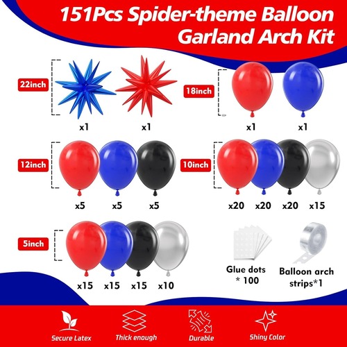 Balon setinin ana renkleri mavi, kırmızı ve siyahtır. Ayırt edici üç renk, filmdeki harika Örümcek Adam figürünü hayal etmenizi sağlayacaktır. Bu setteki lateks balonlar mat kırmızı balon, mat mavi balon, mat siyah balon, metalik şerit balon içerir. Bu setteki folyo balon patlama yıldızı folyo balondur, rengi mavi ve kırmızıdır.