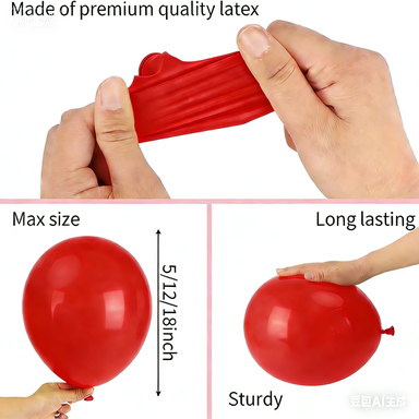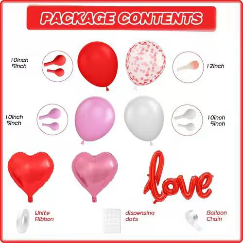 Bu balon seti esas olarak şunlardan oluşur:lateks balonlarve birkaçfolyo balon. Lateks balonları kırmızı, pembe, beyaz renklerdedir. Tamamen çevre dostu ve insan vücuduna zararsız olan %100 doğal lateksten yapılmıştır. Ve bunların boyutları da çeşitlidir. Güzel bir katman oluşturmak için lateks balon boyutları 5 inç ila 12 inç arasındadır. Bunları set halinde düzenlemek çok kolay, nokta tutkalı ve balon zincirini de onunla hazırlıyoruz. Yani düzenlerken bunu esneklikle yapabilirsiniz.